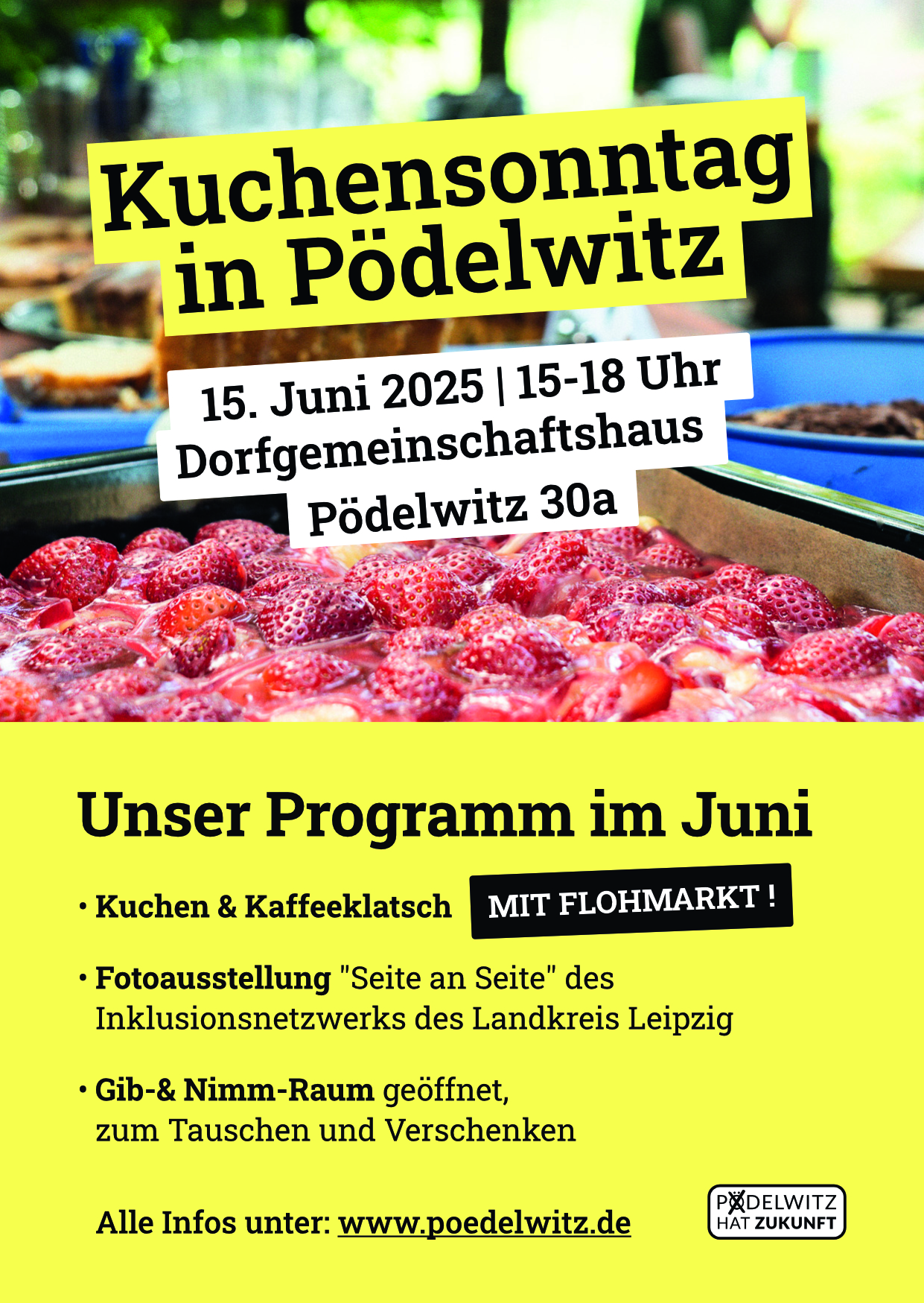 Stände könnt ihr an dorfentwicklung@poedelwitz.de "an Nora" anmelden. Außerdem beherbergen wir die Fotoausstellung "Seite an Seite" des Inklusionsnetzwerks des Landkreis Leipzig. Wie gewohnt wird das Ganze begleitet von Kuchen, Limo und Kaffee.